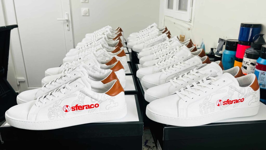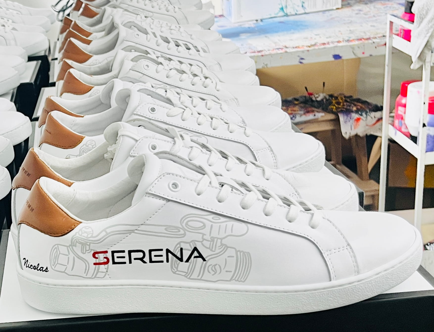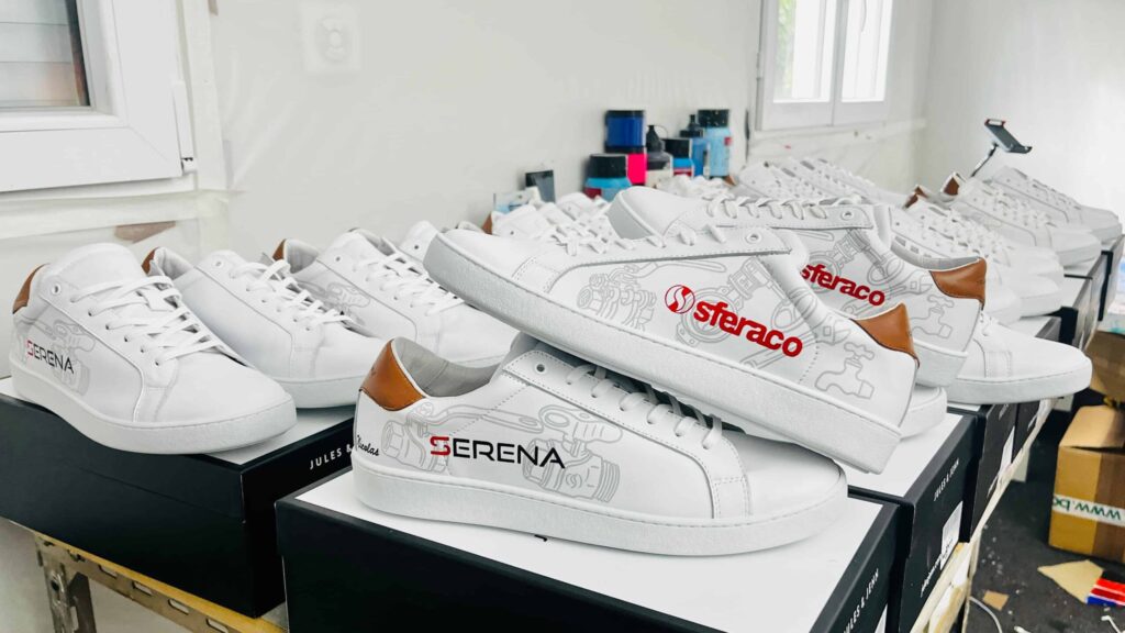 - Des baskets uniques, imaginées autour de votre marque : chaque paire reflète votre identité visuelle et vos couleurs, sans minimum de commande, pour une personnalisation entièrement sur-mesure.